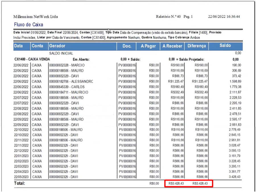 Antes de iniciar o processo de conciliação, vamos emitir o relatório 40 – Fluxo de Caixa, visualizar o valor dos títulos a receber que estão lançados no e-Millennium, para ver a diferença de valores após a conciliação dos títulos.