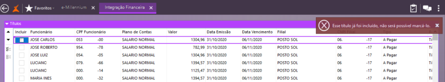 Ao selecionar no XML um registro que já tenha sido importado para o e-Millennium, o sistema emitirá uma mensagem de alerta e não permitirá que a ação seja concluída.
