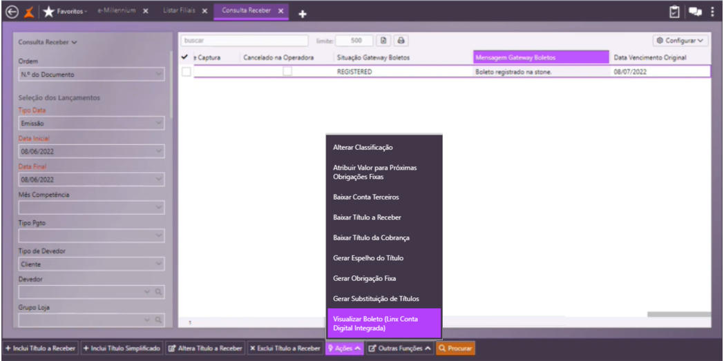 Em Financeiro\A Receber, faça uma busca para visualizar os títulos gerados. Marque o título e acesse o link Ações, selecione a opção Visualizar Boleto Stone.