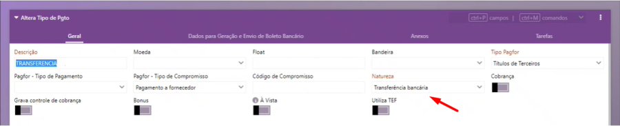 Em Utilitários\Empresa\Cadastro\Tipo de Pagamento, é necessário criar um tipo específico para esse tipo de transação, onde o campo Natureza deverá ser preenchido com a opção Transferência Bancária.