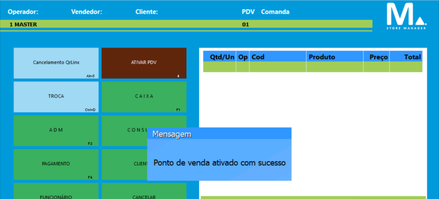 O primeiro passo ao acessar a tela de vendas deve ser a ativação do QrLinx para ser usado nas transações, clicando no botão Ativar PDV.