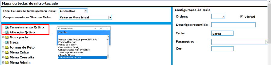 No menu principal, selecione a opção Equipamentos/Microteclado (Mapa das Funções). Para incluir os botões utilize as novas funções criadas: