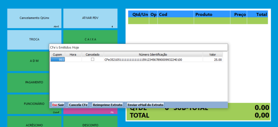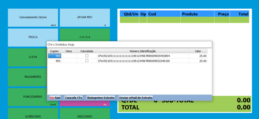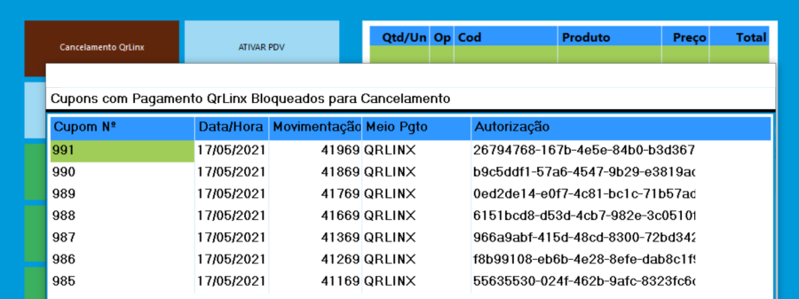Voltando à tela de cancelamento de QRLinx, observe que o cupom 992 não consta mais na lista de pagamentos bloqueados.