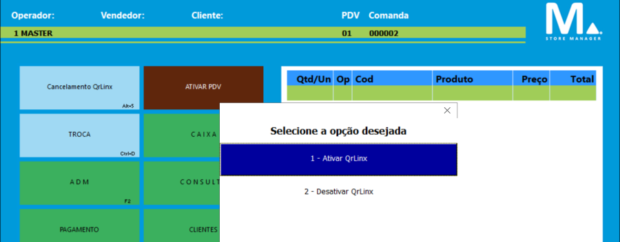 Selecione a opção 1 - Ativar QrLinx, tecle Enter e aguarde a mensagem de confirmação de ativação. Tecle Enter novamente, liberando tela para iniciar as vendas.