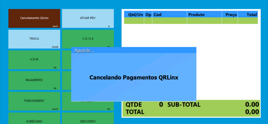 Após lançar os produtos na tela de venda, clique no botão PAGAMENTO e selecione a opção QRLINX e tecle Enter.