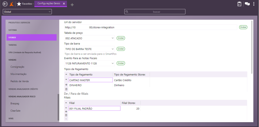 Preencha com o endereço para a conexão de integração com o Storex. Esta informação deverá ser fornecida pela própria Storex.