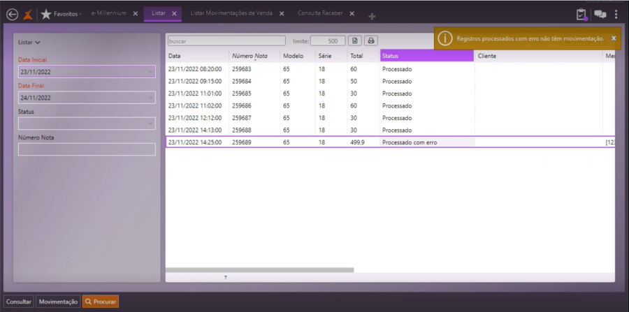 IMPORTANTE! Para as movimentações geradas a partir das integrações com Storex não será possível fazer consultas no link Status NFe, porque o XML das notas fiscais emitidas não é enviado na integração, com as demais informações da venda efetuada.