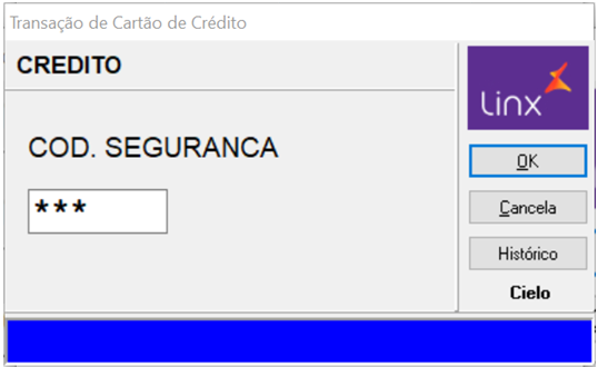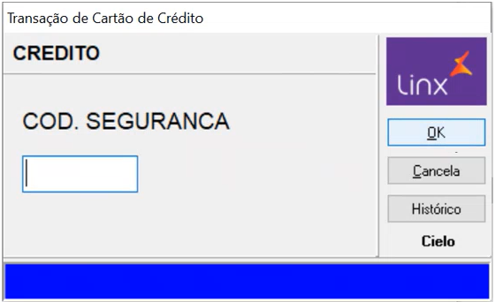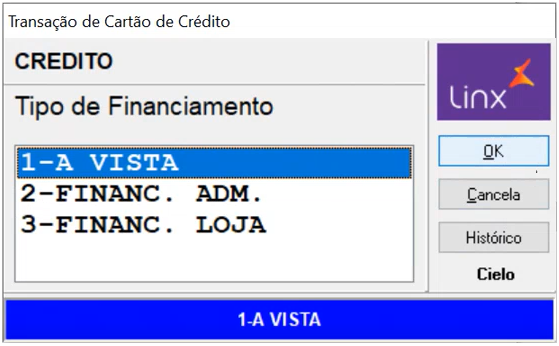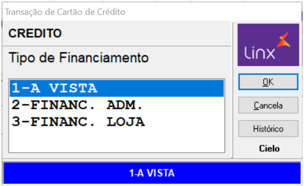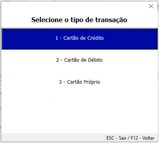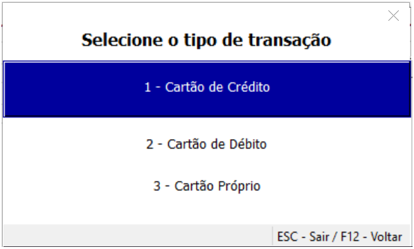 Selecione o tipo de transação a ser feita, por exemplo, Cartão de Crédito e tecle Enter. | |