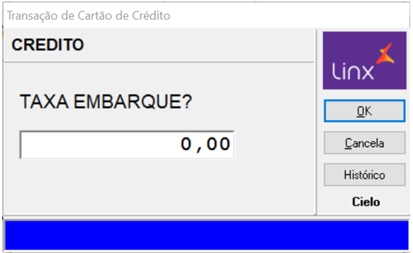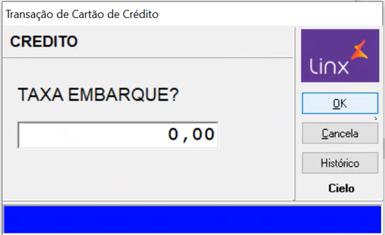 Selecione o tipo de transação e clique OK. | Digite a taxa de embarque, se houver. |