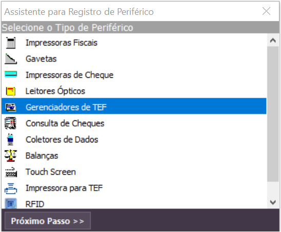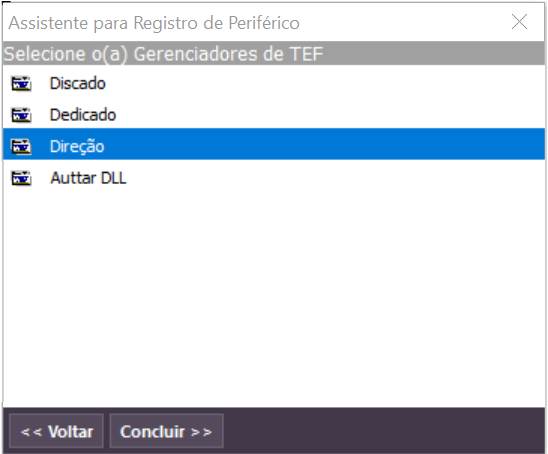 No Gerenciador de Periféricos do e-Millennium, selecione Gerenciadores de TEF e clique em Próximo passo. Na sequência, selecione a opção Direção e clique em Concluir.