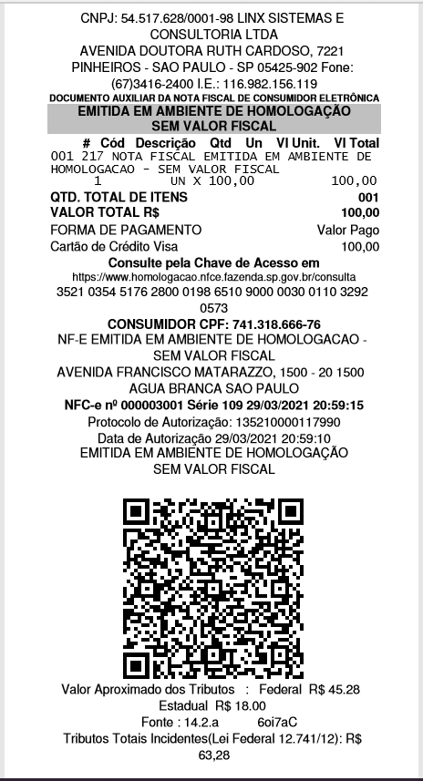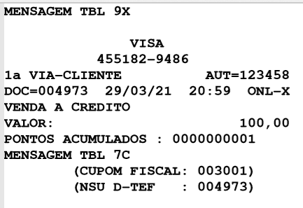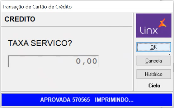 Digite a taxa de serviço, se houver. | Aguarde a mensagem de transação aprovada e a impressão do cupom fiscal e do comprovante. |