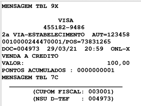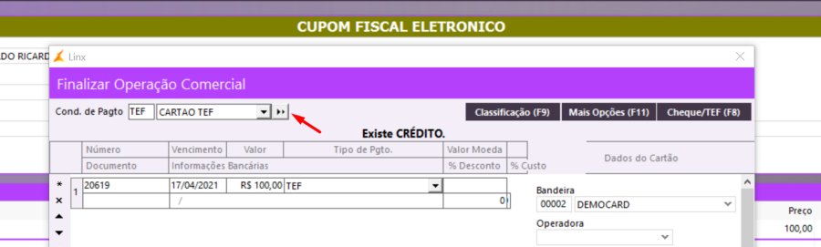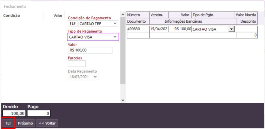 No campo Tipo de Pagamento, selecione um tipo com cartão e clique no botão TEF.