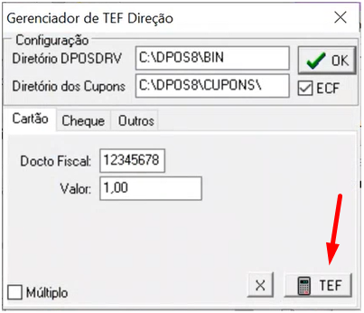 Selecione TEF Direção, clique no botão Configura e depois no botão TEF. | |