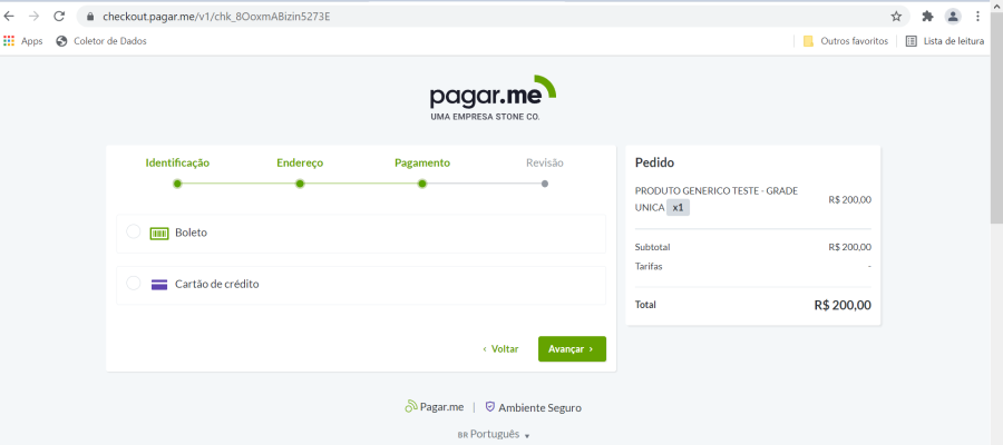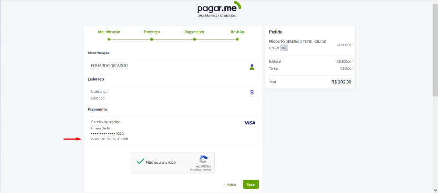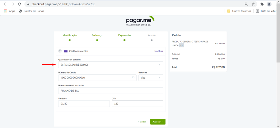 Preenchidos os dados do cartão, clicando em Avançar, serão exibidos os dados do consumidor, endereço de entrega e os valores a pagar para uma conferência final.
