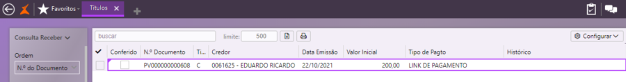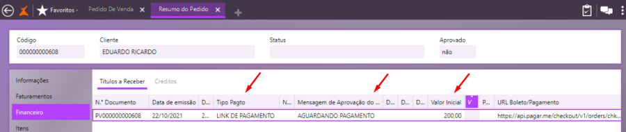 Outro comportamento importante a ser observado é referente ao título a receber gerado no momento da efetivação do pedido de venda. Como o sistema ainda não sabe qual será a forma de pagamento que o consumidor irá selecionar, será gerado um título de adiantamento financeiro no valor total do pedido e com o tipo de pagamento informando apenas que se trata de um link de pagamento.