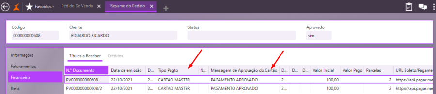 Ao consultar o resumo do pedido de venda observe que o tipo de pagamento agora mostra que se trata de cartão de crédito, a mensagem informa que o pagamento foi aprovado e há dois títulos no valor de R$ 100,00, no lugar do título de R$ 200,00 que havia inicialmente. Isso porque o consumidor escolheu a forma de pagamento cartão e parcelou em duas vezes o valor de sua compra. Caso haja tarifas, os valores dos títulos no Millennium permanecerão com os valores originais, sem as tarifas.