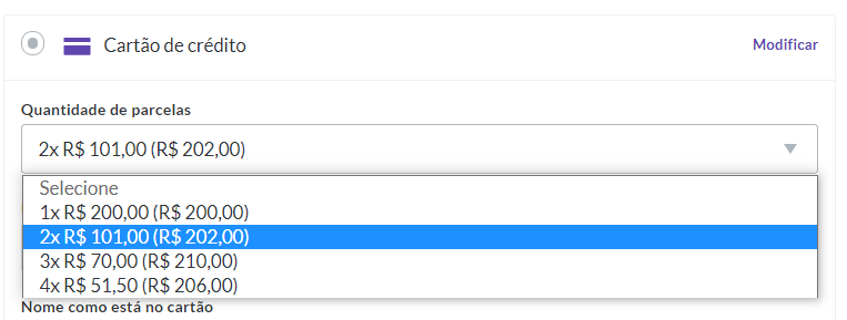 No campo Quantidade de Parcelas serão exibidas somente as opções configuradas no cadastro de tipo de pagamento e o consumidor terá que optar por uma delas, não podendo definir ele próprio por um parcelamento que não esteja pré-estabelecido nas configurações do sistema.