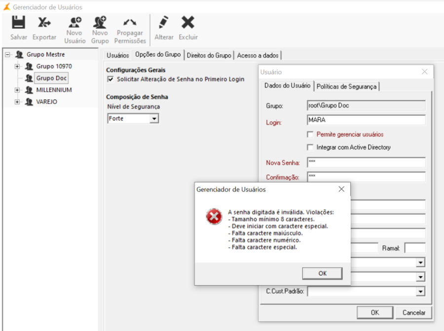 Observe que ao tentar cadastrar uma senha, que não atende aos critérios do nível médio, para um novo usuário do grupo, o sistema emite uma mensagem de alerta e informa que a senha escolhida não está de acordo com o nível de segurança para o qual está sendo gerada.