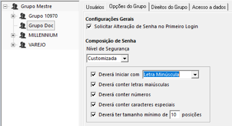 Ao selecionar o nível customizado, o sistema exibirá os elementos disponíveis para a composição da senha. O usuário poderá selecionar todos os elementos ou apenas uma combinação entre alguns deles.