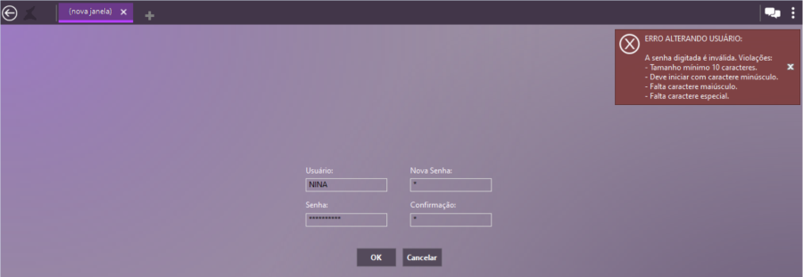Atenção! A senha que o usuário escolher deverá obedecer aos critérios do nível de segurança, definido no Gerenciador de Usuários para o grupo ao qual ele pertence.