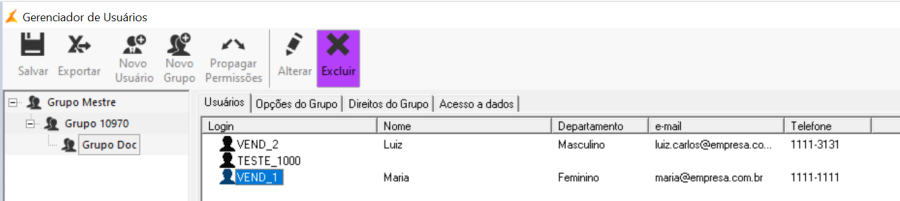 Selecione o grupo, clique na guia Usuários e depois selecione o usuário a ser excluído. A seguir, clique no botão Excluir e confirme a operação.