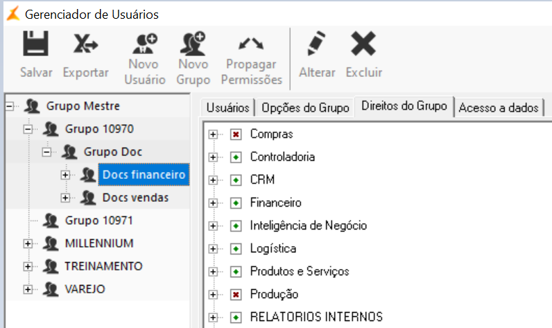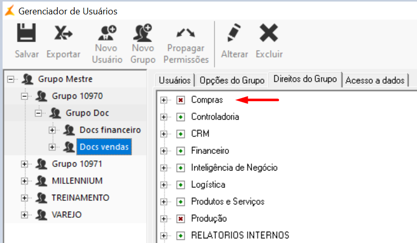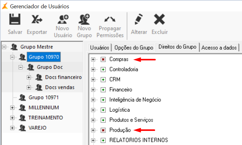 Observe no Grupo 10970 que os módulos de Compras e Produção estão bloqueados. Então, vamos liberar o módulo de Compras para o Grupo 10970 e para o sub-grupo Docs Financeiro.
