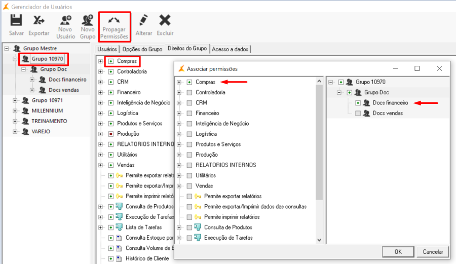- Na janela Associar Permissões, marque o módulo de Compras e o sub grupo Docs Financeiro