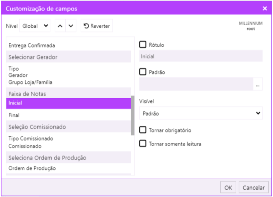 Após clicar em OK, o sistema levará alguns segundos para exibir a nova posição dos campos na tela. Aguarde para ver o resultado. Perceba que o campo INICIAL agora está acima do campo FINAL.