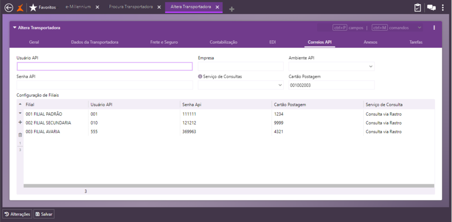 - Preencher a tabela de cartões de postagem (Se forem várias filiais utilizando o serviço ao mesmo tempo)