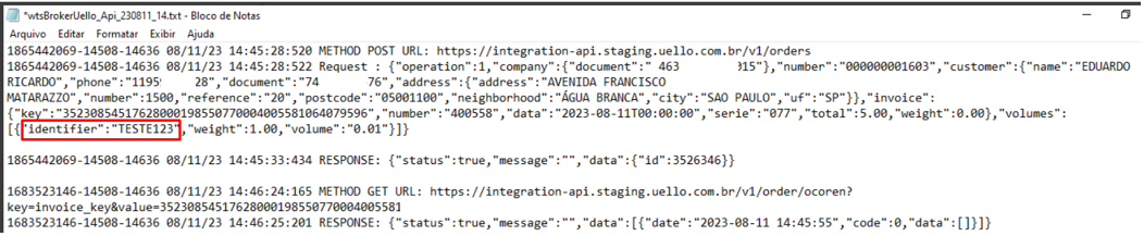 7. Conforme solicitado pela transportadora Uello, para enviar no campo "identifier" do json o campo "NUMERO_OBJETO" da tabela VOLUMES_EVENTO: