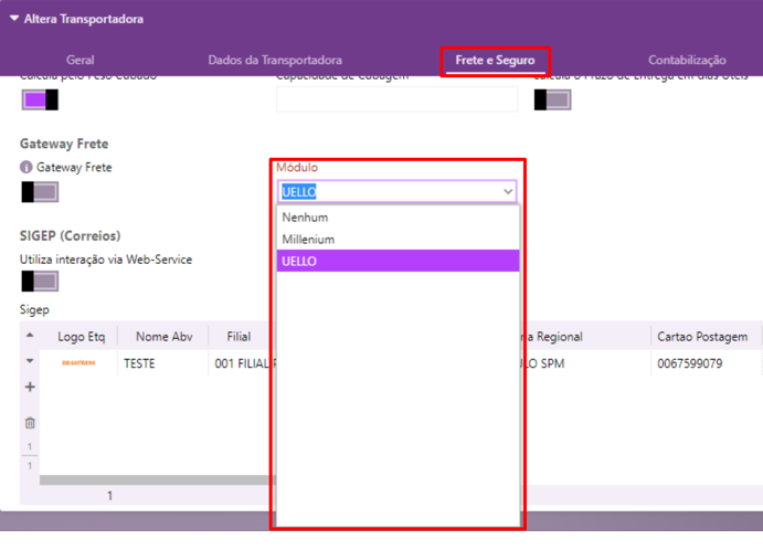 Configurar a Transportadora para ser vinculada ao Gateway Uello pelo caminho: Logística > TMS > Cadastros > Transportadora, aba “Frete e Seguro”;