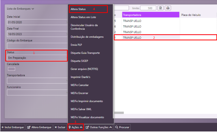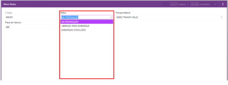Preencha o campo “Status” e selecione o embarque desejado listado na tabela;