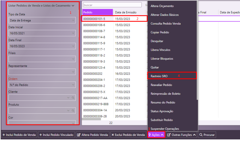 Preencha as informações de busca na coluna e selecione o Pedido na tabela;