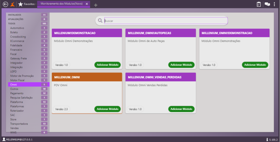 Por padrão, os módulos listados nesta tela não estarão ativados no sistema, ou seja, para utilizar estes recursos será necessário fazer a instalação de cada um deles.