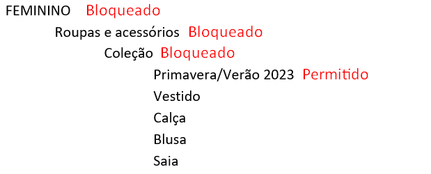 - Adiciona produto somente no último nível das classificações – Quando existem vários níveis na árvore de categorias de produtos na vitrine, por uma questão de organização, este parâmetro não permitirá que sejam incluídos produtos fora do último nível, para que a exibição no site não fique desorganizada, por exemplo: