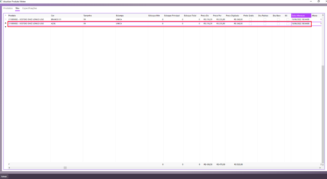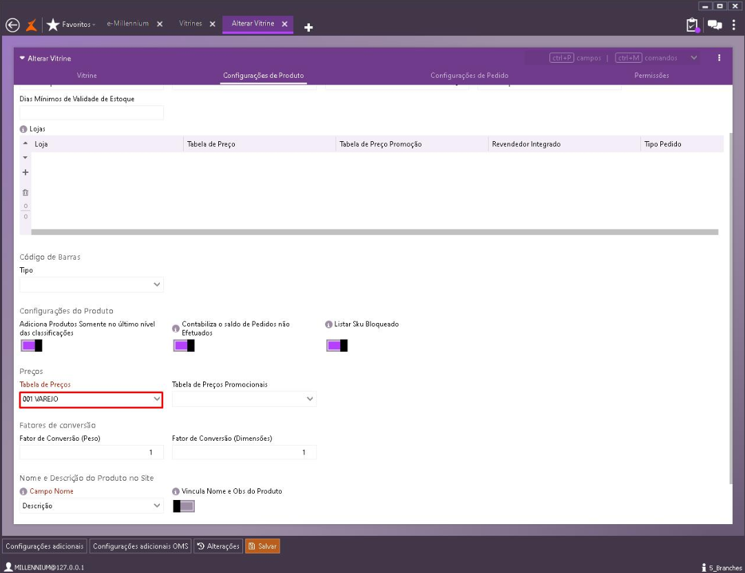 -Produtos e Serviços \ Vitrine \ Vitrines \Selecionar a vitrine com exportar LINX IO \ Alterar \ configurações de produto \ tabela de preços.
