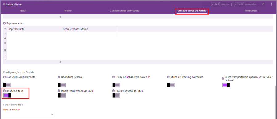 Na configuração da vitrine "Brinde Cortesia" quando ativada passa itens que são brindes para cortesia. A flag que identifica o item como brinde passa para falso e o valor dele passa para o campo Cortesia no pedido.