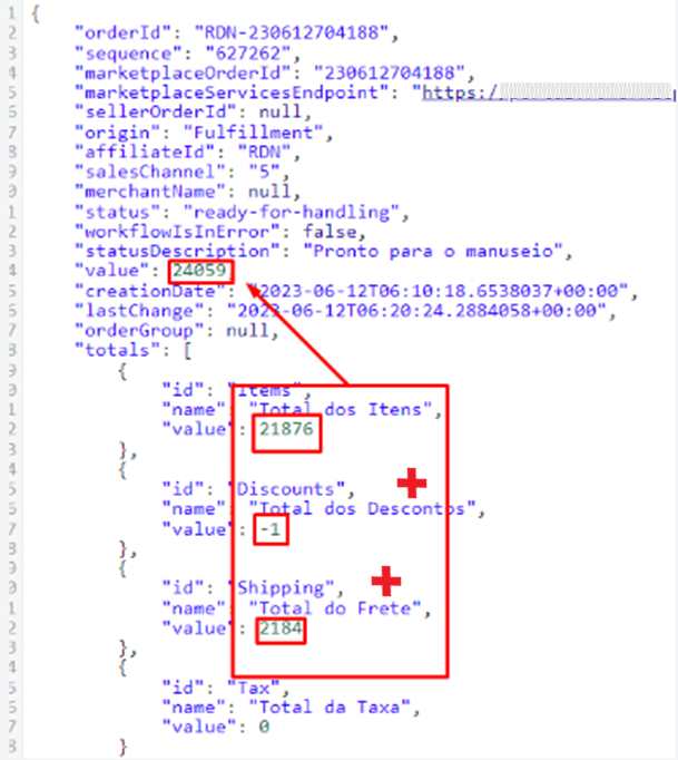 Logo, para que este pedido seja integrado considerando o valor DISCOUNT@SELLERPRICE, informe nas configurações adicionais da vitrine que o campo deve ser somado ao valor do item. Assim, neste cenário, o valor do item ficará com 1 centavo a menos e o pedido será integrado.