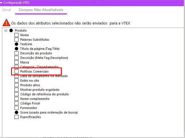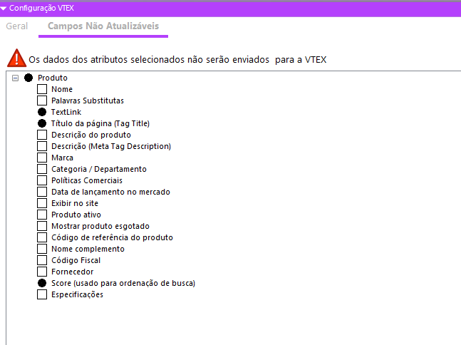 Conforme imagem abaixo, neste painel o cliente pode marcar o atributo que queira ou não atualizar na VTEX, justamente para não interferir em algum item cadastrado diretamente na plataforma.