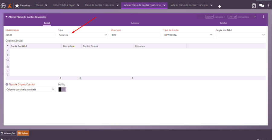 Na tela Financeiro > Pagar > Títulos, ao incluir um Título, na aba "Classificação e Contabilização", o campo "Plano de Contas" só recebe planos do Tipo "Analítico" e não "Sintético".