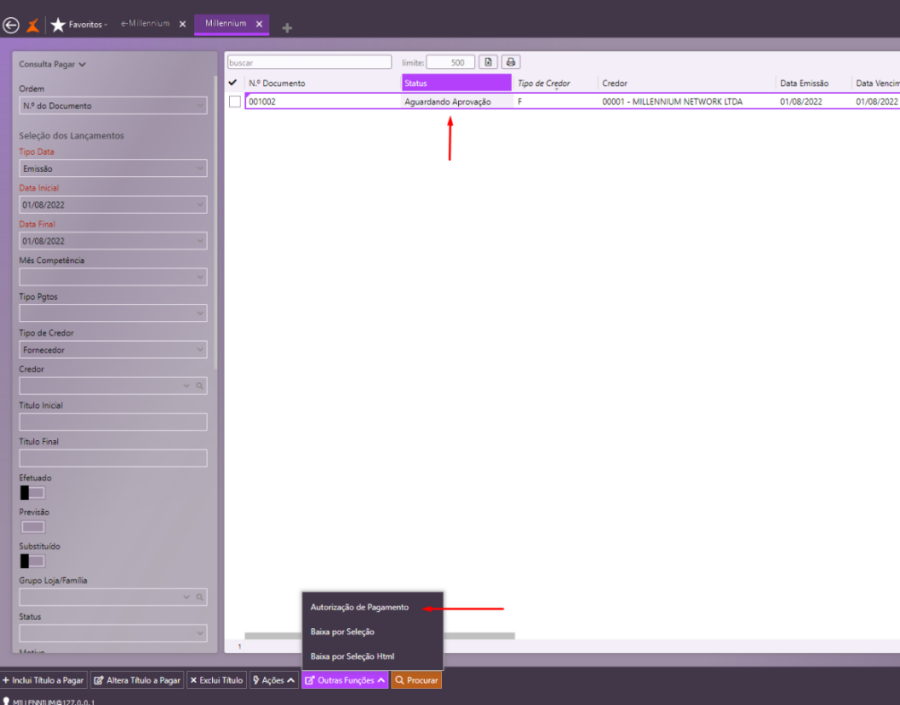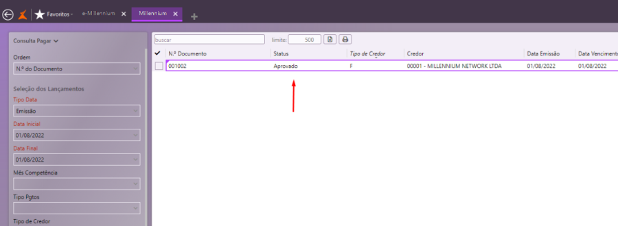 Para que um título a pagar seja exibido no filtro e seja possível incluí-lo no borderô, é necessário que o título esteja com o status "Aprovado".