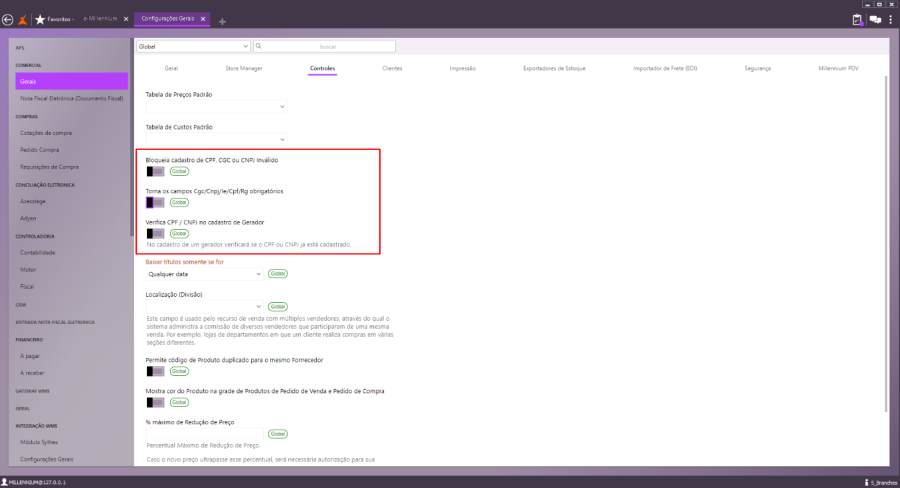 O boleto não estava sendo gerado corretamente pelo fato do CNPJ informado no cadastro do cliente ser um CNPJ inválido. Para corrigir e conseguir emitir o boleto, primeiramente é necessário acessar as configurações gerais e desmarcar as opções exemplificadas na imagem abaixo, pois são validações em relação ao CNPJ/CGC/IE.