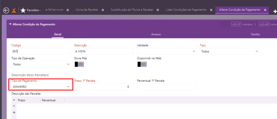 Ao tentar realizar a substituição de títulos a receber, quando selecionar a opção Gerar pela condição de pagamento, quando abre a tela para selecionar o tipo de pagamento, um dos campos que é o "tipo de pagamento" fica inativo, impossibilitando de selecionar outra opção.