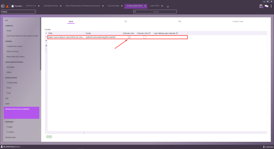 Problema no recebimento automático do XML CTe, sistema de ICMS não está seguindo a regra parametrizada no perfil do produto. No Menu > Configurações gerais > Controladoria > Entrada Nota Fiscal Eletrônica e marcar parâmetro calcular ICMS. Após a marcação da configuração, ao realizar a importação do XML novamente, será possível visualizar o valor correto na tela de consulta notas.