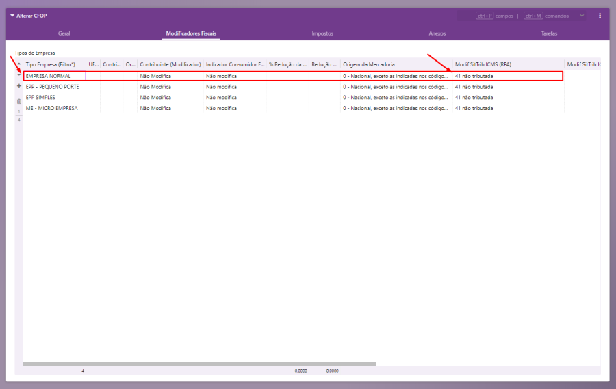 Ainda no mesmo cadastro da CFOP 2.352 na Aba Modificadores fiscais, há uma regra cadastrada para empresa do tipo normal, com a CST 41. Desta forma, o sistema leva em consideração o que está no cadastro da CFOP e não o que está no perfil de imposto. Para que seja considerado o que está no perfil é necessário excluir a regra do cadastro da CFOP ou alterá-la para 90, assim como no perfil de imposto.