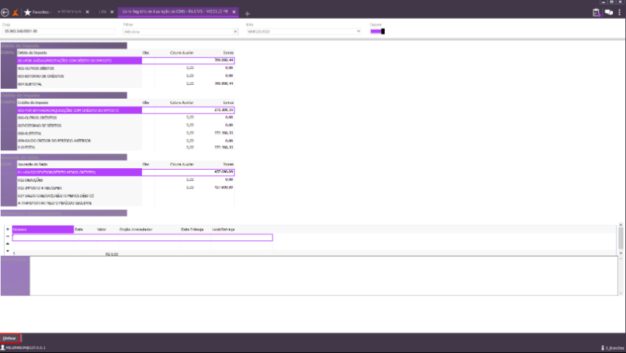 O relatório não está totalizando na página final os impostos de débito, crédito e apuração do saldo.