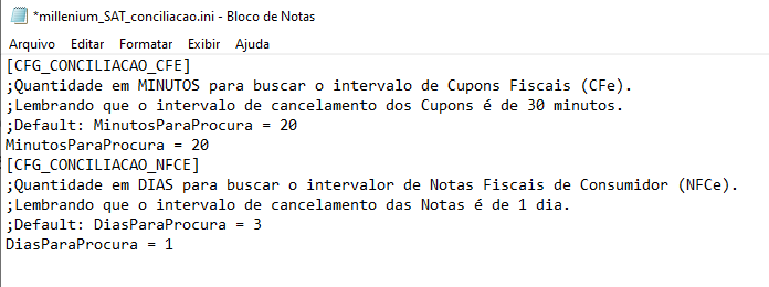 - Após a instalação do MilleniumSAT_Conciliacao configurar o arquivo millenium_SAT_conciliacao.ini que estará na pasta C:\wts\, para a quantidade de dias necessário para abranger o período das Notas. Depois que estiverem atualizados voltar o parâmetro DiasParaProcura = 1"
