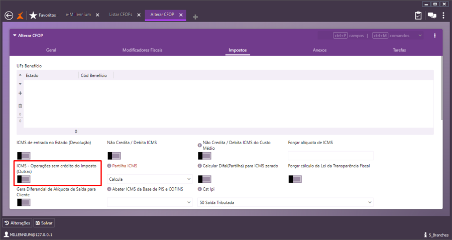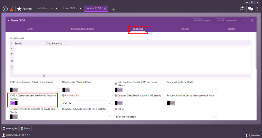 Após entrar no CFOP, vamos na aba "Imposto", nele é possível observar que o parâmetro "ICMS - Operações sem crédito do Imposto (Outras)" está habilitado, assim para que estes valores sejam exibidos na coluna "Isenta ou Não Tributadas" do relatório é necessário desmarcar esta opção.