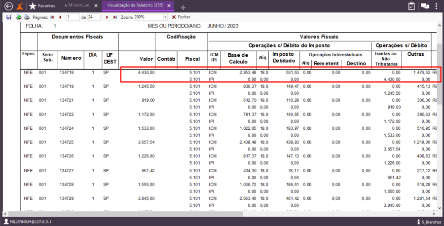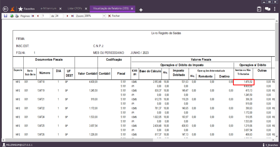Relatório 355 – Livro Registro de Saídas, apresenta diferença da redução da base de cálculo, deveria vir no campo "Isentas ou Não Tributadas" ao invés do campo "Outras".