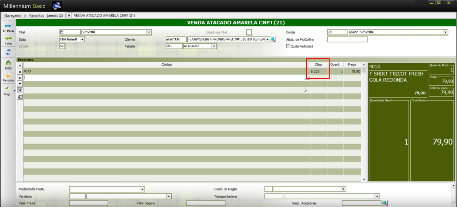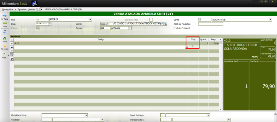 Ao tentar efetuar o faturamento da venda de um produto no Millennium Basic, o sistema não está preenchendo o CFOP do produto de forma automática e também não está deixando o usuário preencher o respectivo campo manualmente.